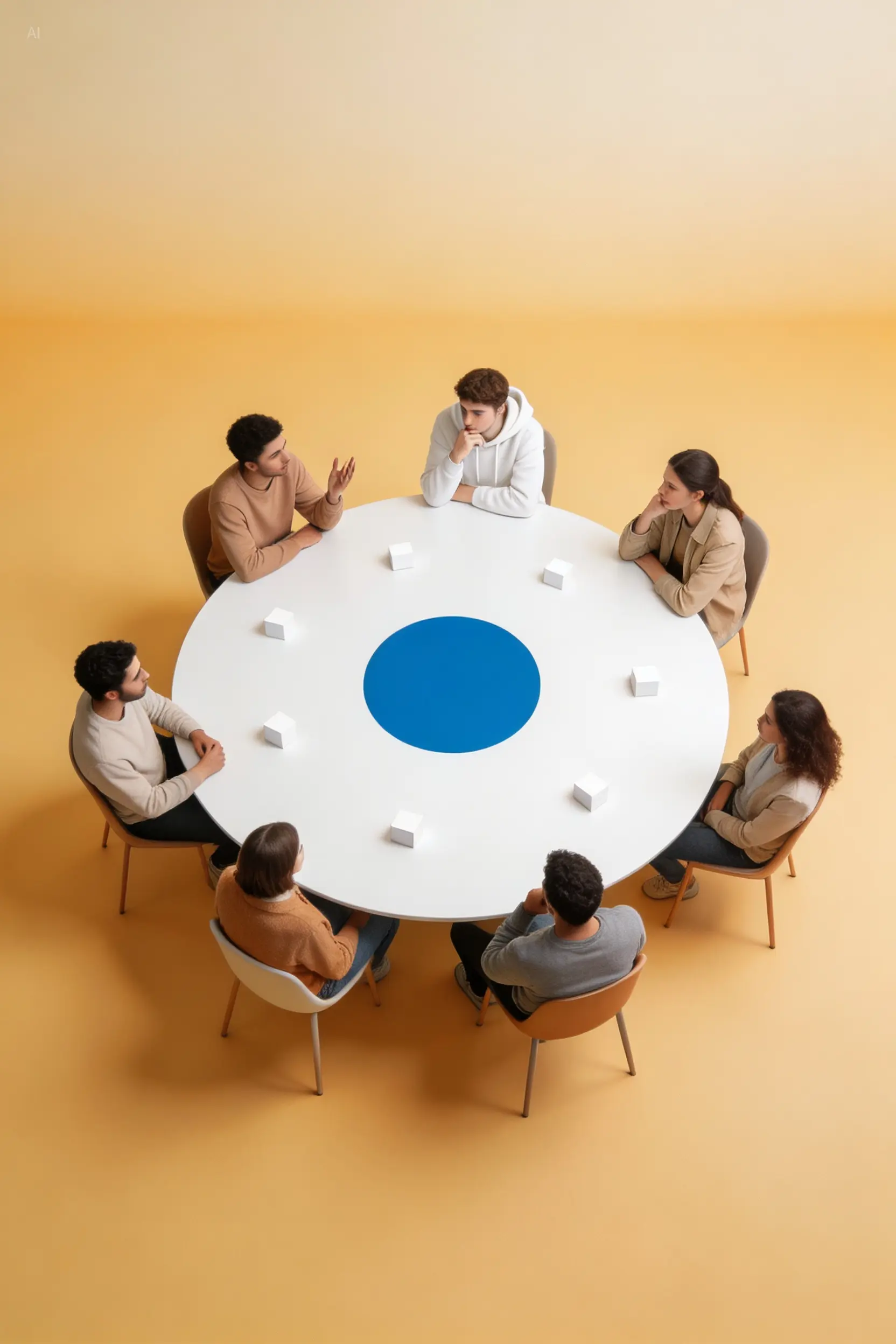 Minimalist style, top-down composition, wide-angle framing, warm color palette, yellow tones. A huge white circular table, with a blue circular decoration at its center. Scattered around are several small white cubes. Several people are seated around the table, wearing various outfits—some are talking, others are deep in thought. The background is a yellow wall with a soft gradient from light yellow to deep yellow. Panoramic view, deep depth of field.